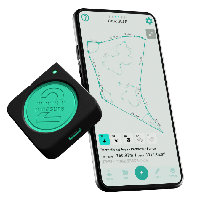 Moasure takes more than 500 sensor measurements every second as you move. Measuring its own movement in three dimensions, Moasure knows its own position in 3D space doesn't rely on GPS, phone signal or daylight, making it easy to single-handedly measure distance, perimeter, area, changes in elevation and more – at any time, in any place.